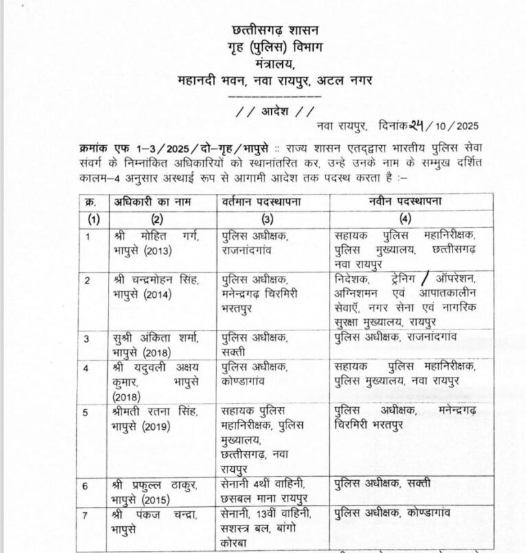 रायपुर। छत्तीसगढ़ शासन के गृह (पुलिस) विभाग ने राज्य पुलिस सेवा के अधिकारियों के प्रशासनिक फेरबदल के अंतर्गत 7 अधिकारियों के स्थानांतरण आदेश जारी किए हैं। यह आदेश महानदी भवन, नवा रायपुर, अटल नगर से जारी किया गया है। जारी आदेश (क्रमांक एफ 1–3/2025/2-गृह/बीपीएस) के अनुसार, राज्य पुलिस सेवा संवर्ग के निम्नलिखित अधिकारियों को उनके नाम के सम्मुख दर्शित नवीन पदों पर तत्काल प्रभाव से आगामी आदेश तक अस्थायी रूप से पदस्थ किया जाता है।