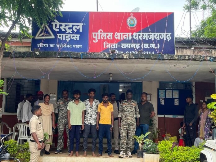 अरूण कुमार विश्वकर्मा की रिपोर्ट पर थाना धरमजयगढ़ में अपराध क्रमांक 234/2024 के तहत धारा 103(1), 296, 351(2), 115(2), 3(5) बी.एन.एस. के अंतर्गत मामला दर्ज किया गया। पुलिस अधीक्षक दिव्यांग कुमार पटेल के मार्गदर्शन और पुलिस अनुविभागीय अधिकारी सिद्धांत तिवारी के निर्देशन में तुरंत कार्रवाई करते हुए धरमजयगढ़ पुलिस ने तीनों आरोपियों – सनातन राय (30 वर्ष), सुमित चक्रवर्ती उर्फ मिथुन (20 वर्ष), और राजू उर्फ राजीव राय (22 वर्ष), निवासी ग्राम मेंढरमार – को गिरफ्तार कर न्यायिक रिमांड पर भेज दिया है। इस कार्रवाई में स.उ.नि. अमृत मिंज, प्रधान आरक्षक एडमोन खेस्स, आरक्षक विजय राठिया, विनय तिवारी, ललित राठिया, देवनंदन राठिया, बीरबल टोप्पो,और हेमलाल बरेठ ने उल्लेखनीय भूमिका निभाई।