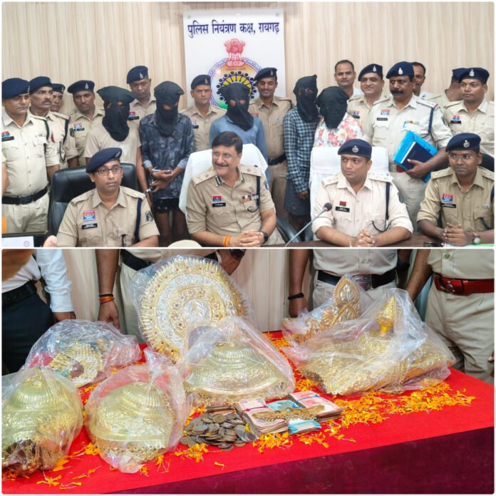 रायगढ़ । रायगढ़ के प्रतिष्ठित श्री श्याम मंदिर (Shri Shyam Temple)से धार्मिक आभूषण(Jewellery) और नकदी की सनसनीखेज चोरी की गुत्थी रायगढ़ पुलिस (Raigarh Police)ने सुलझा ली है। इस मामले में सीमावर्ती ओडिशा(Odisha) राज्य और पड़ोसी जिले सारंगढ़-बिलाईगढ़ (Sarangarh-Bilaigarh)से छह आरोपियों की गिरफ्तारी के साथ लगभग 27 लाख रुपये की चोरी की संपत्ति की बरामदगी पुलिस के लिए एक बड़ी उपलब्धि है। पुलिस महानिरीक्षक(IG) बिलासपुर रेंज डॉ संजीव शुक्ला (Dr Sanjeev Shukla)के सतत मार्गदर्शन और रायगढ़ पुलिस अधीक्षक दिव्यांग पटेल के कुशल नेतृत्व में चलाए गए इस 9 दिवसीय अभियान ने यह साबित कर दिया कि धार्मिक आस्था को ठेस पहुंचाने वाले अपराधियों को छिपने की कोई जगह नहीं मिलेगी। 13-14 जुलाई की रात अज्ञात आरोपियों ने मंदिर के मुख्य द्वार और गर्भगृह का ताला तोड़कर अंदर प्रवेश किया और श्याम बाबा का सोने का मुकुट, कान की बाली, चार नग छत्र, लगभग 25 लाख रुपये के धार्मिक आभूषण और दानपेटी से दो लाख रुपये नकद लेकर फरार हो गए। घटना की रिपोर्ट श्री श्याम मंदिर मंडल के अध्यक्ष बजरंग लाल अग्रवाल द्वारा कोतवाली थाने में दी गई, जिसके आधार पर अज्ञात आरोपियों के विरुद्ध अपराध क्रमांक 335/2025 धारा 331(4), 305 भादवि पंजीबद्ध किया गया।